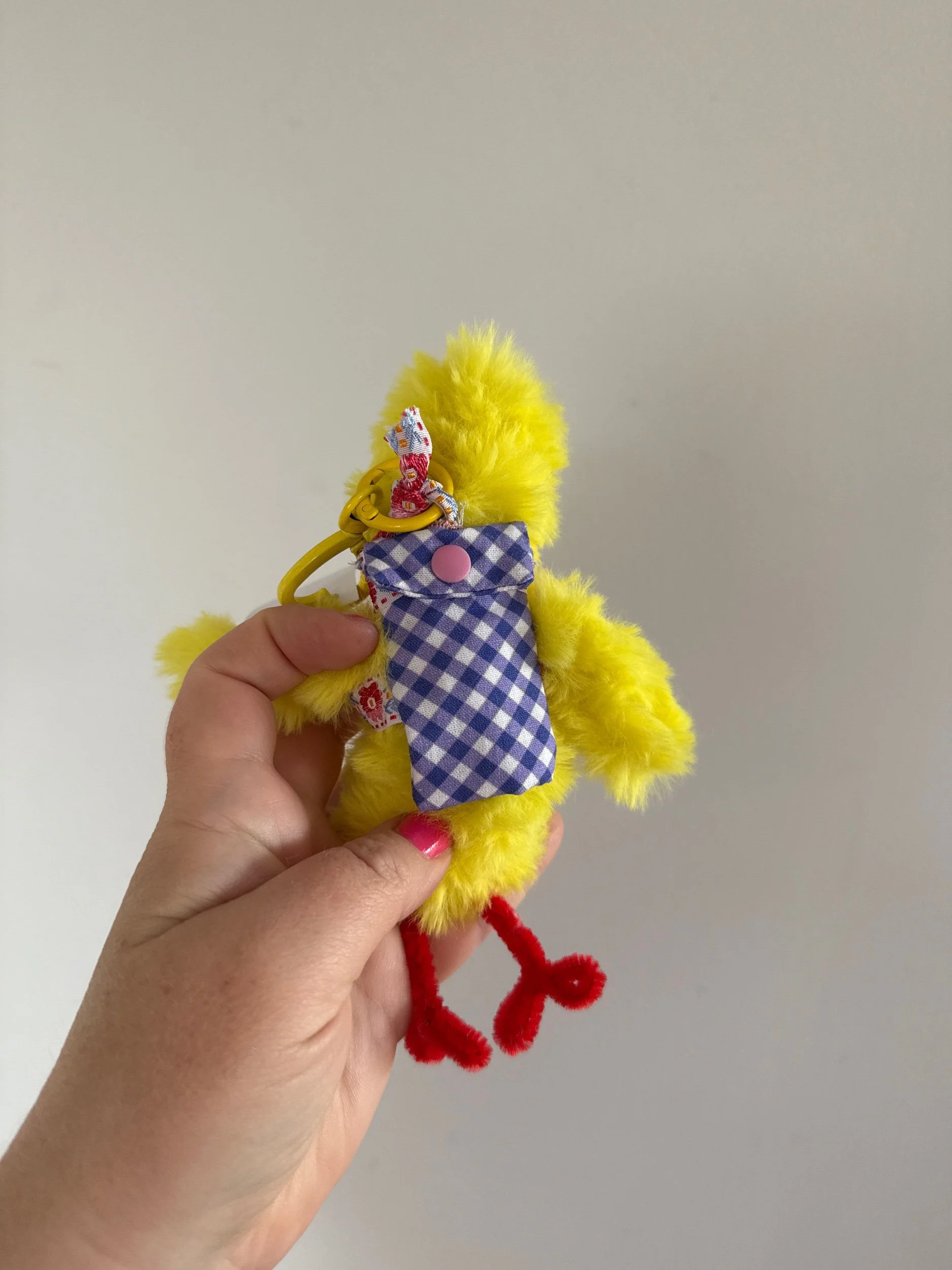 hese cute little handmade chenille bag decorations are made with a tiny hand sewn backpack which opens with a press stud, meaning you can keep your coins, trinkets and a hidden message inside! Each one is one of a kind, never to be made again. Each one attaches with a heart keyring, and it safe and secure to take on adventures!